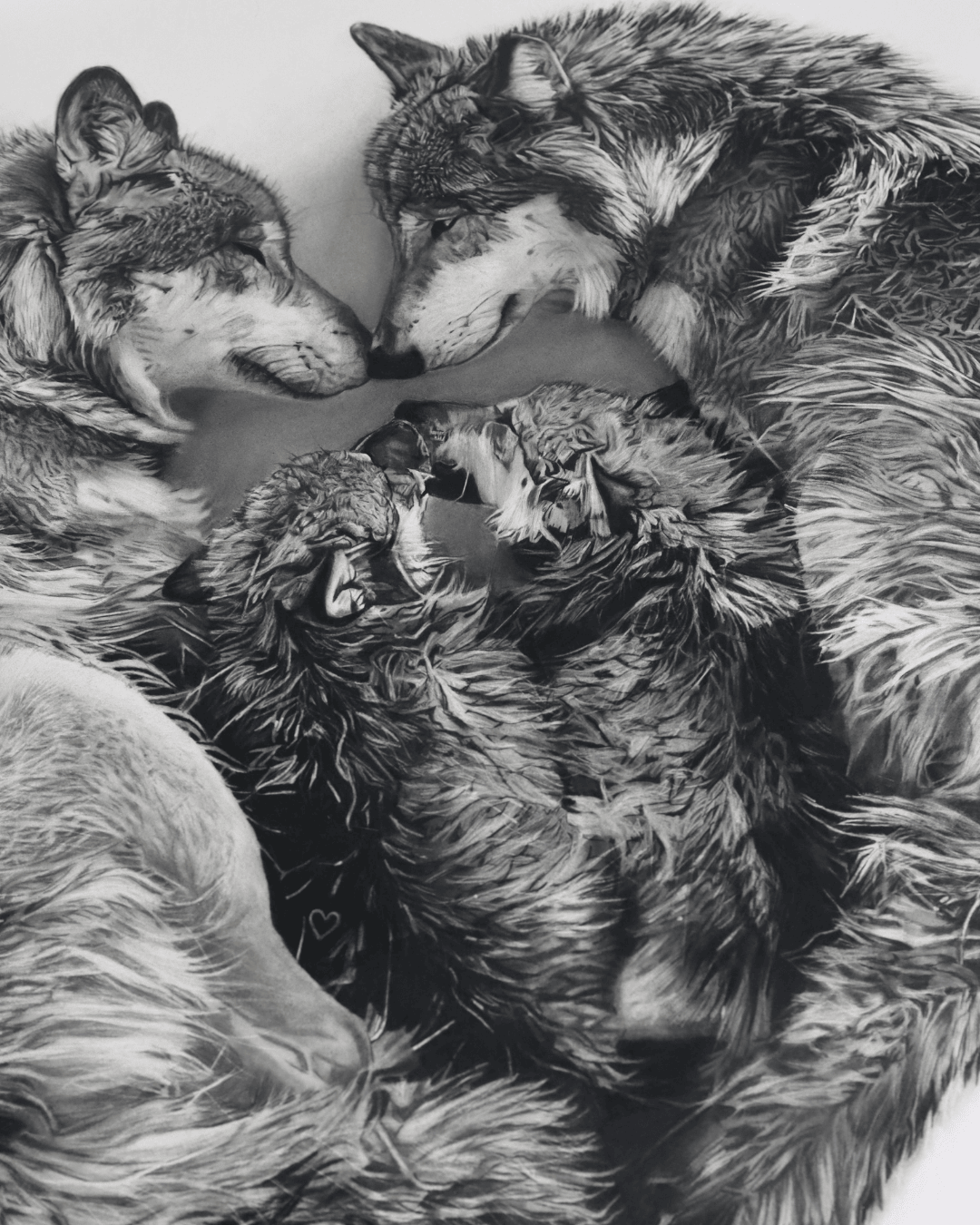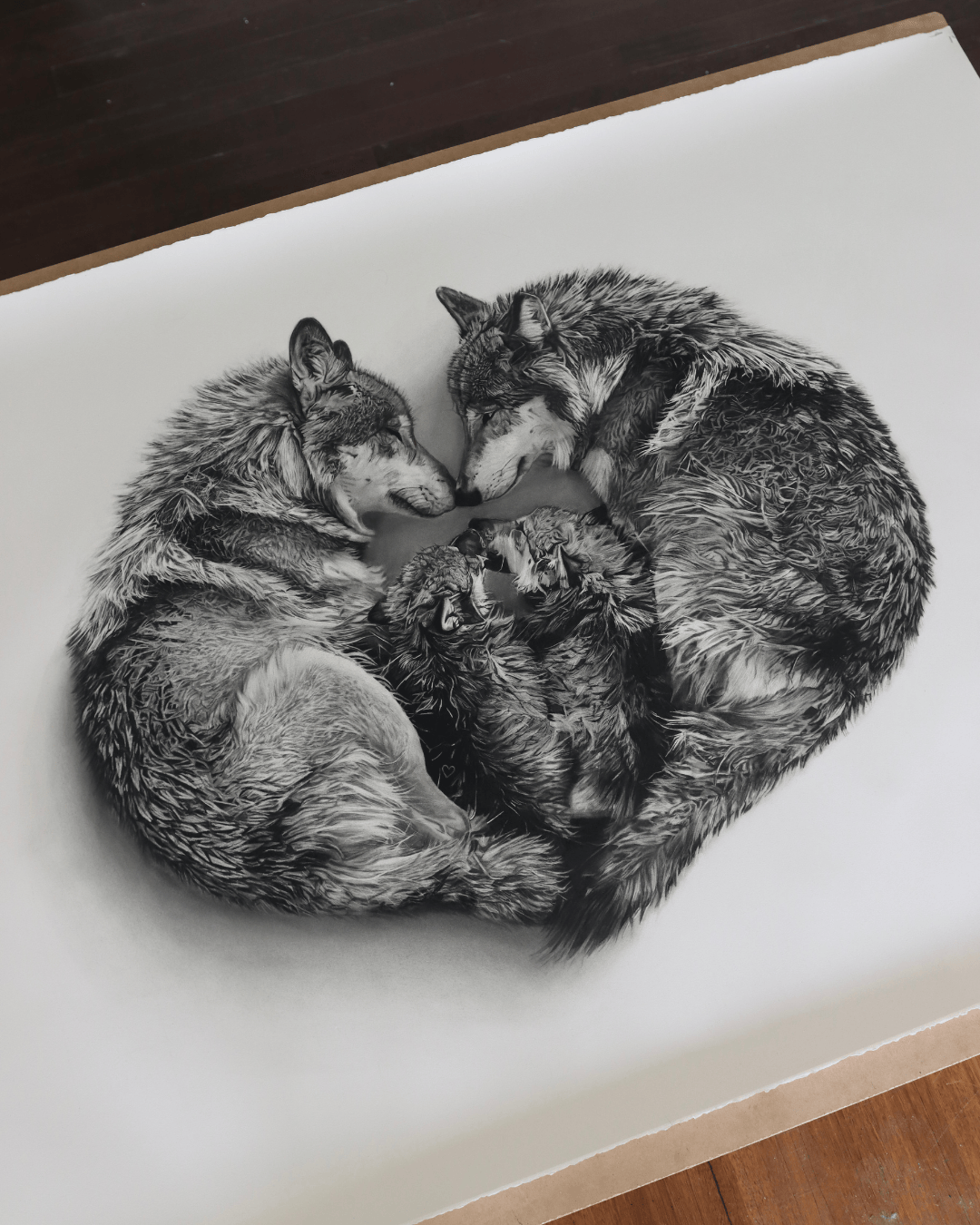 Wolves are defined by their social bonds and collective responsibility. In this composition, the parents form a protective outer structure, their bodies creating a subtle heart shape that shelters the pups at the centre. The image is not about dominance or threat. It is about strength expressed through care.