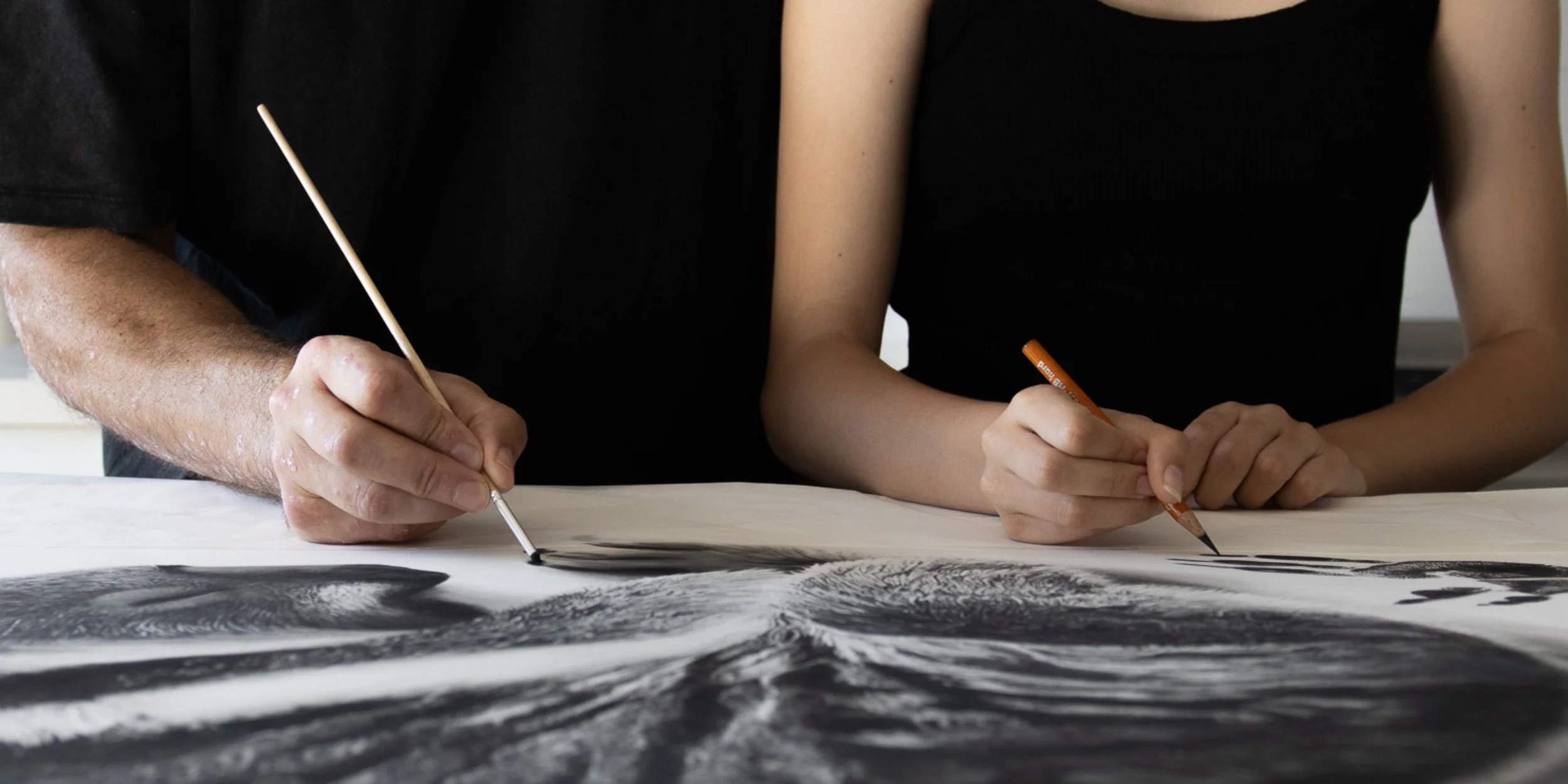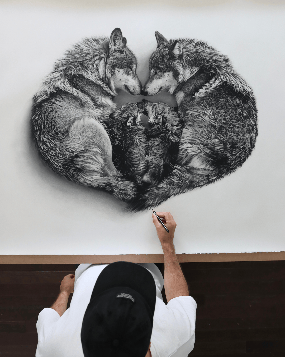 With the wolves complete, the second Wild Hearts piece is now underway. Elephants, with their deep familial bonds and generational memory, are beginning to take shape on the paper, revealing a different energy and rhythm. Beyond them, orangutans are planned, a species defined by care, intelligence and connection.